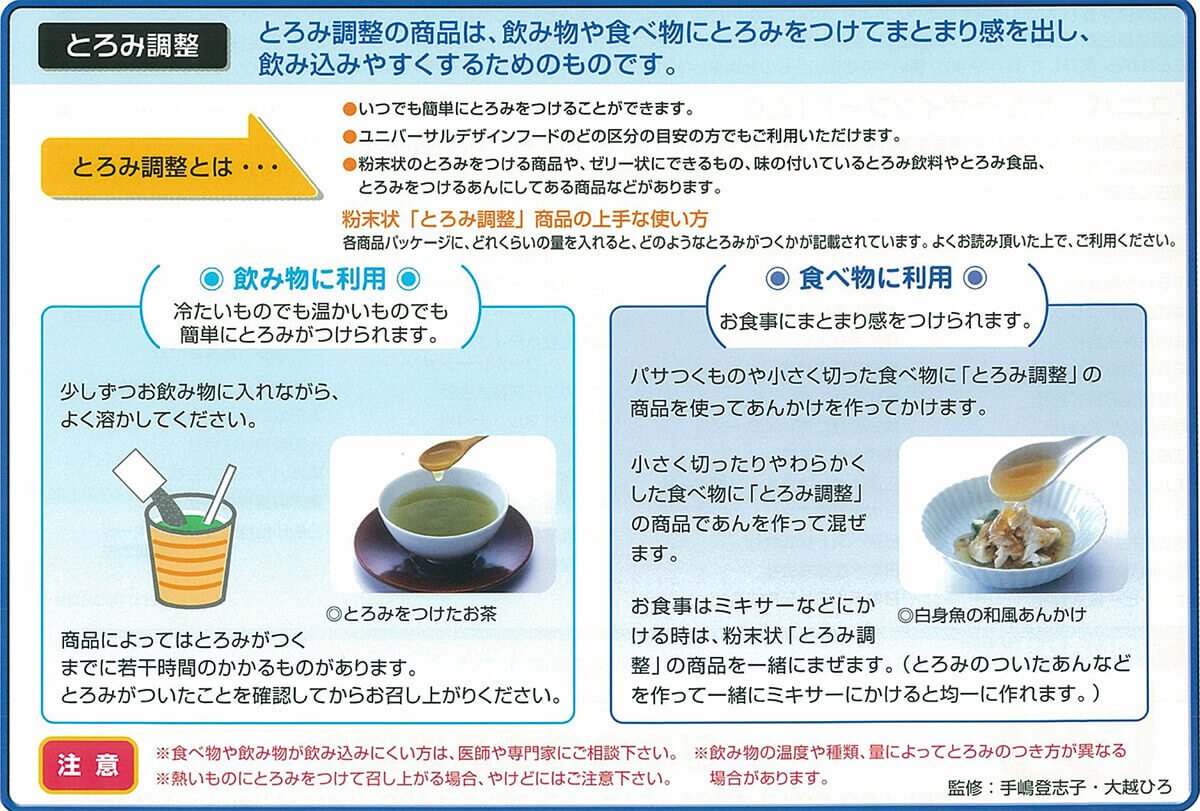 UDFは、あくまで市販されるパッケージ食品のための業界自主規格ですが、飲食店には「噛むことが難しい」お客様もいらっしゃいます。お客様やご家族から「柔らかい料理はありますか?」と尋ねられたときのために、UDFの考え方を参考に準備しておくことが考えられます。