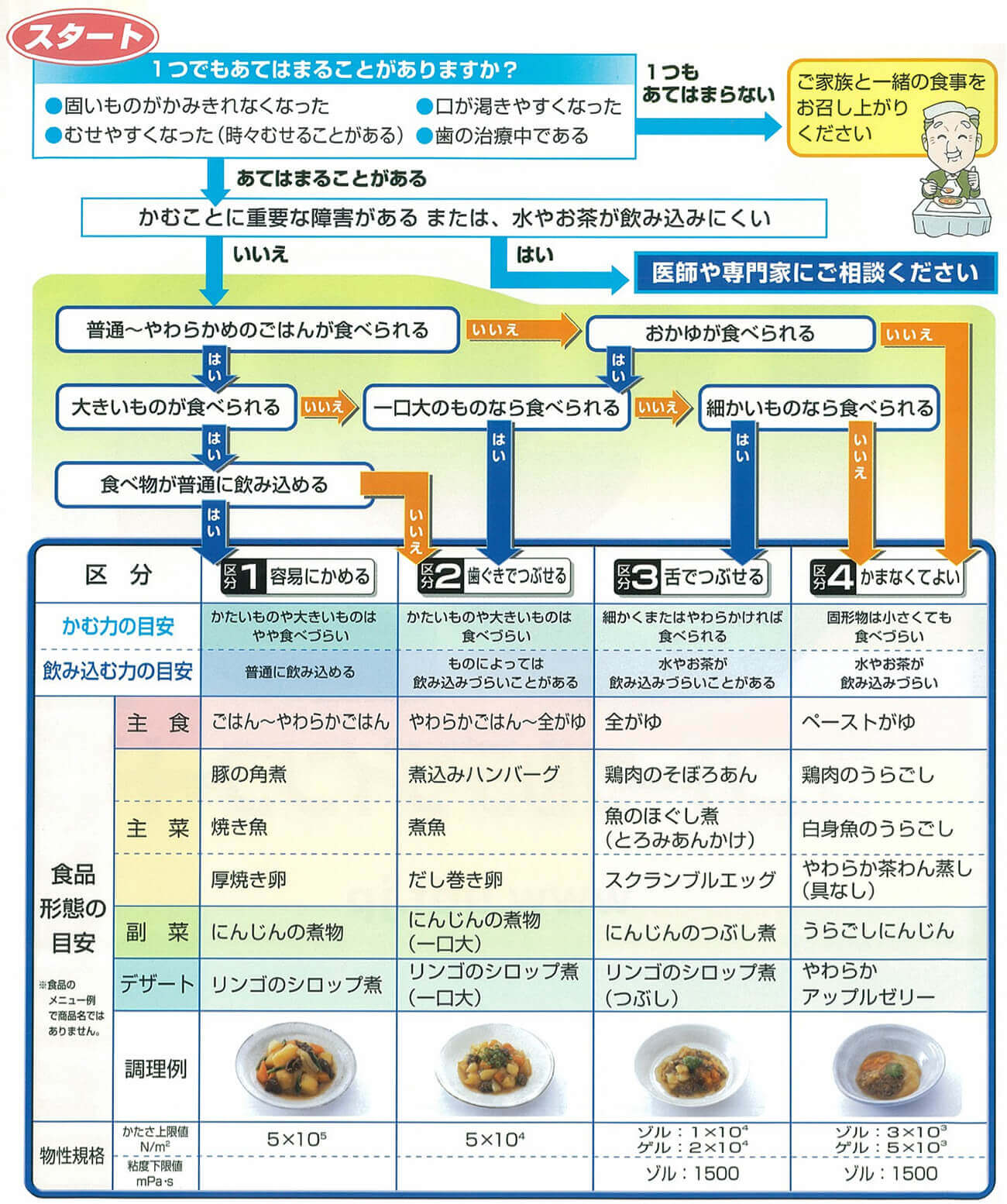 各区分の目安とメニュー開発のヒントになる具体的な料理例は以下の通りです。これは、在宅で利用される方々が商品を選ぶ際の目安として、「区分1〜4」「とろみ調整」で区分けされたものです。